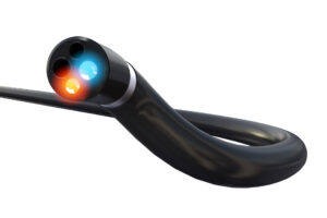 The objective lens is typically a super-wide-angle lens in order to visualize a large area of tissue at one time. In order to view tumor tissue in a more detailed manner, some endoscopes have an optical zoom feature. They also support high-definition video displays.  Light guide fiber bundles conduct light from the external light source through the endoscope to illuminate body cavities. Endo-therapy devices are pushed in and out of the instrument channel for harvesting tissue (biopsy), removing tumors, cauterizing bleeding lesions, etc. The nozzle on the distal tip is used to clean the lens with water and expand body cavities by insufflating them with air.